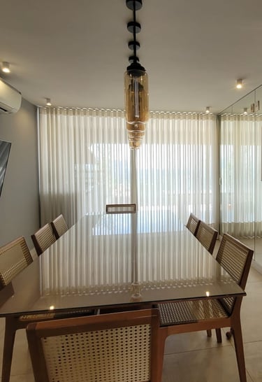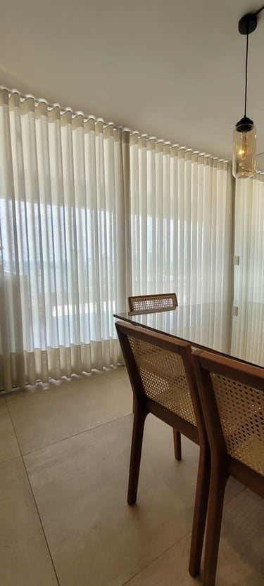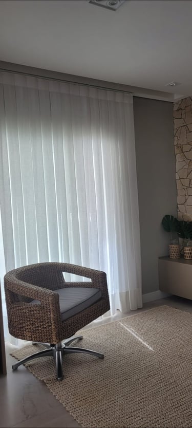 Esse modelo de cortina vem muito bem estruturado lá de cima, com um caimento em linha reta, requer um pouco mais de tecido, assim seu fechamento é maior do que os outros modelos, ideal para quartos e salas.