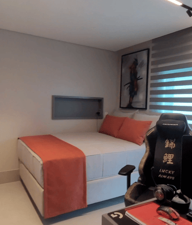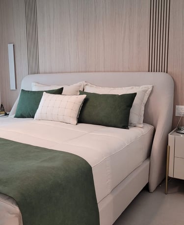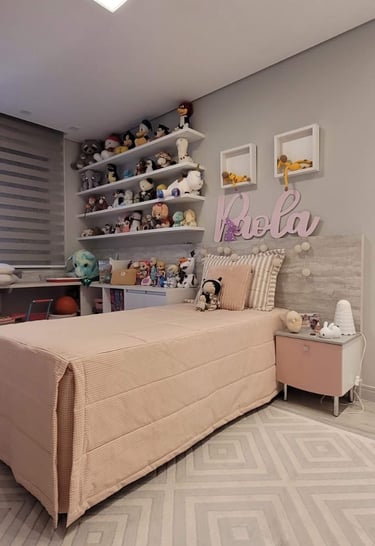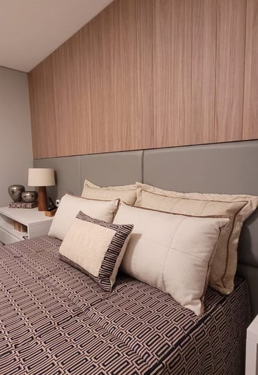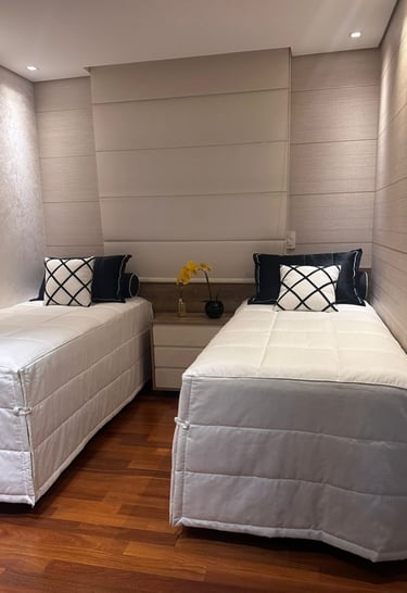 todo o enxoval de cama é pensado em tudo, em cada detalhe, desde a textura do toque do tecido, e das cores e suas combinações tudo sob medida e escolhidos com muito carinho para trazer aconchego e sofisticação para o quarto.