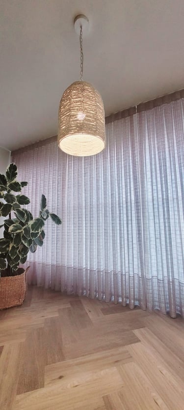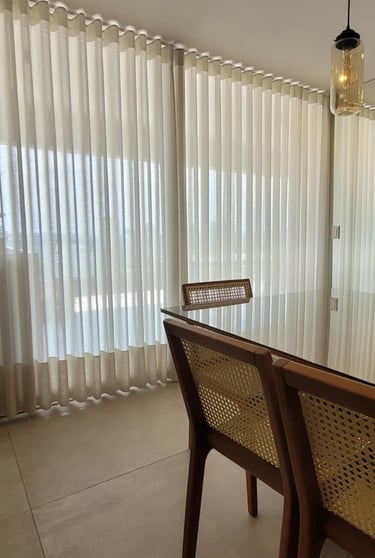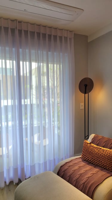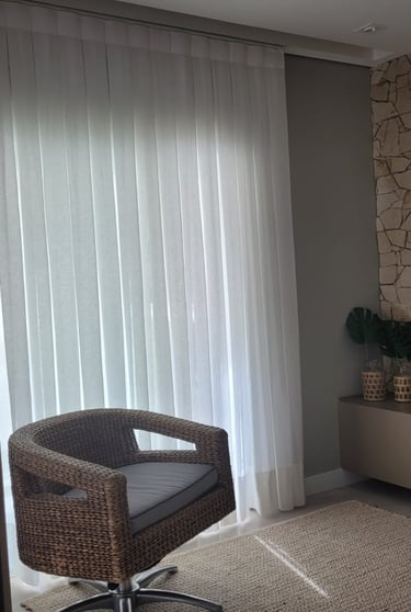 Esse modelo de cortina vem muito bem estruturado lá de cima, com um caimento em linha reta, requer um pouco mais de tecido, assim seu fechamento é maior do que os outros modelos, ideal para quartos e salas.
