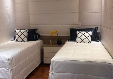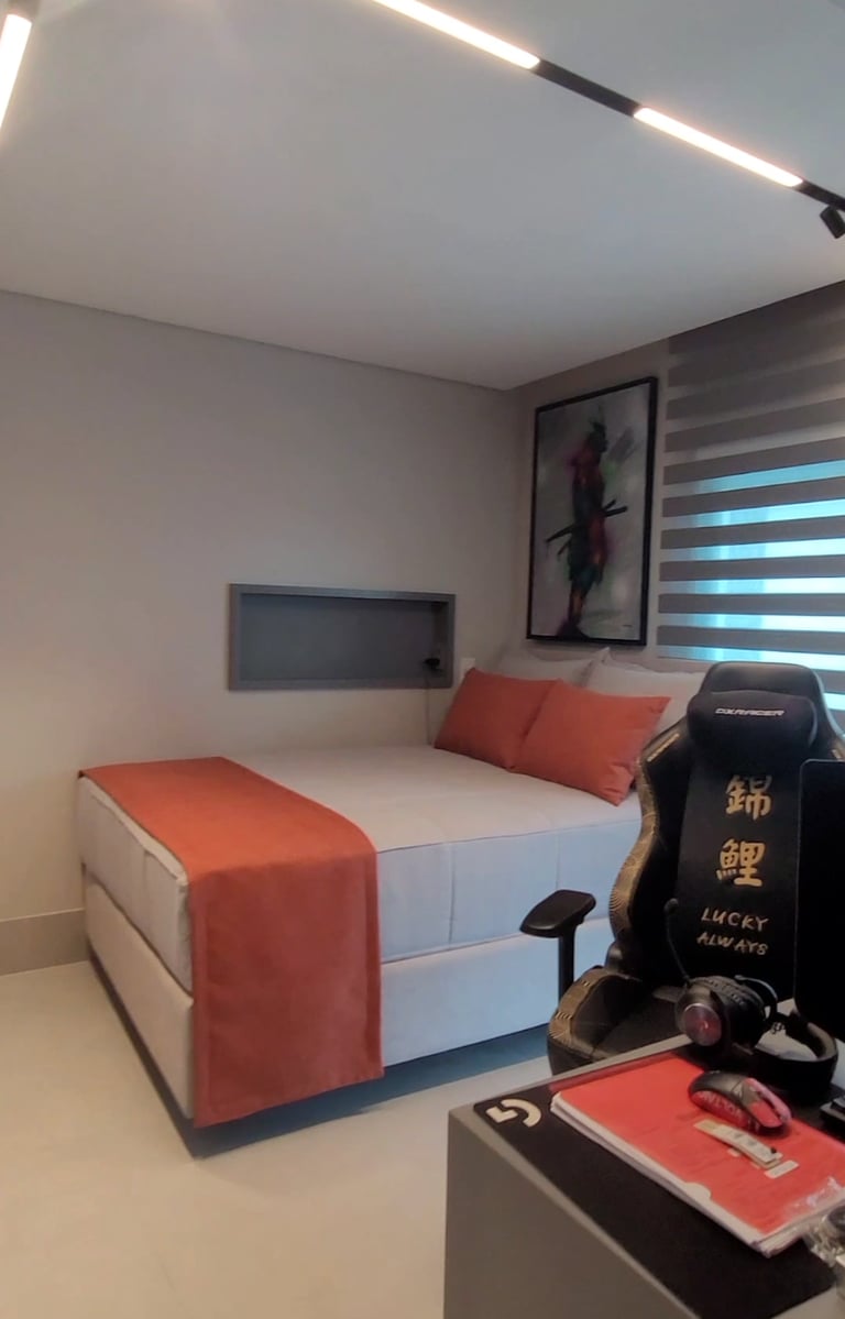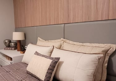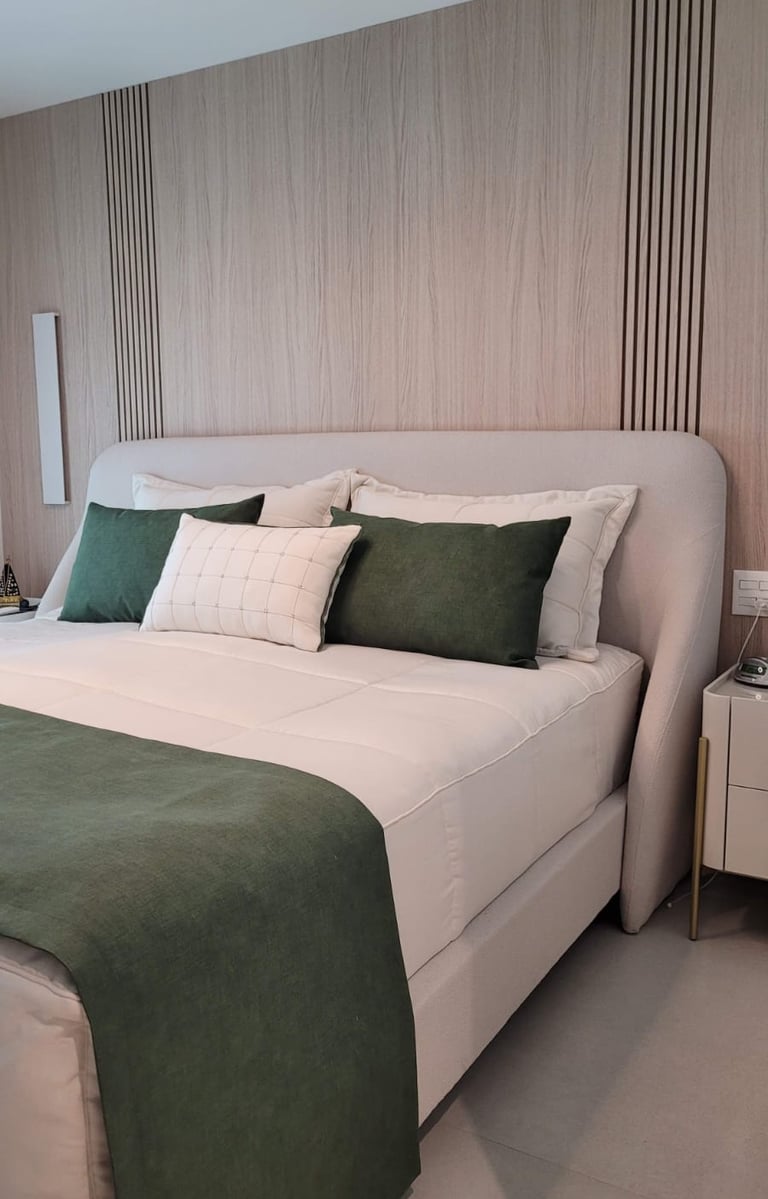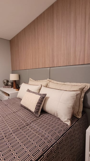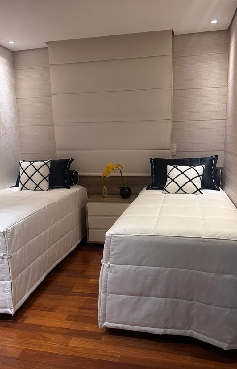 todo o enxoval de cama é pensado em tudo, em cada detalhe, desde a textura do toque do tecido, e das cores e suas combinações tudo sob medida e escolhidos com muito carinho para trazer aconchego e sofisticação para o quarto.